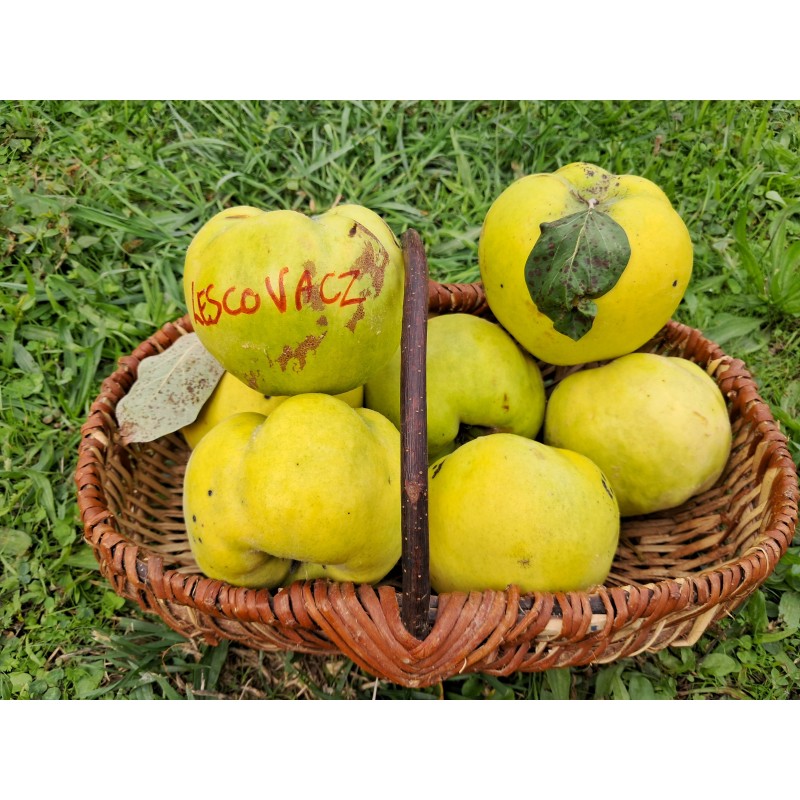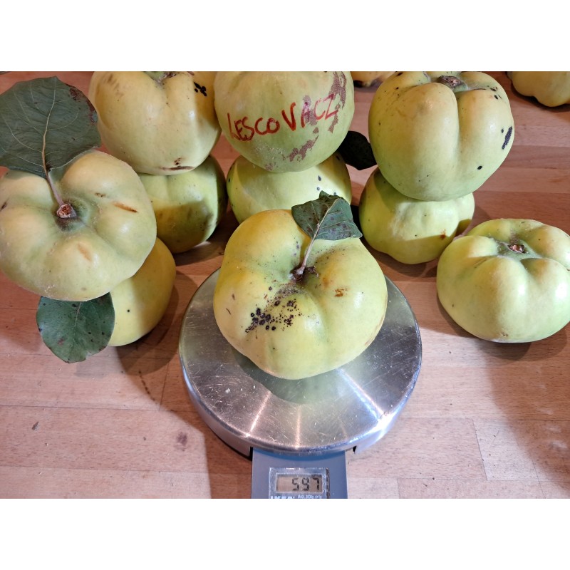 Cognassier Leskovacz est un très gros coings d'1.5kg, chair jaune, sucrée, très parfumée, jaune duveteux, chair jaune clair, sucrée.