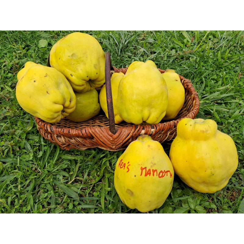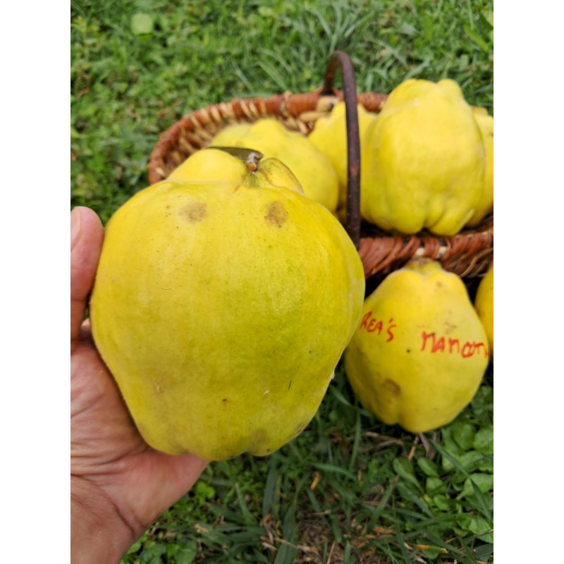 Cognassier à GROS FRUITS jaunes et parfumés, Res'a mammoth est une variété à fruit en forme de poire (600gr). Cognassier de vigueur moyenne à port étalé. Les fruits arrivent à maturité vers début Novembre. Les fruits se conservent bien, variété autofertile.